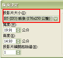 下拉⌈投影片大小⌋點選⌈B5⌋或⌈A5⌋