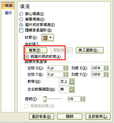 接下來點選⌈檔案⌋挑選底紋後,記得勾選⌈將圖片砌成紋理⌋,按下確認就可以了。