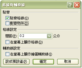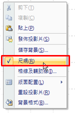 在簡報內按下右鍵,勾選⌈尺規⌋再點選⌈格線與輔助線⌋,勾選⌈貼齊格線⌋